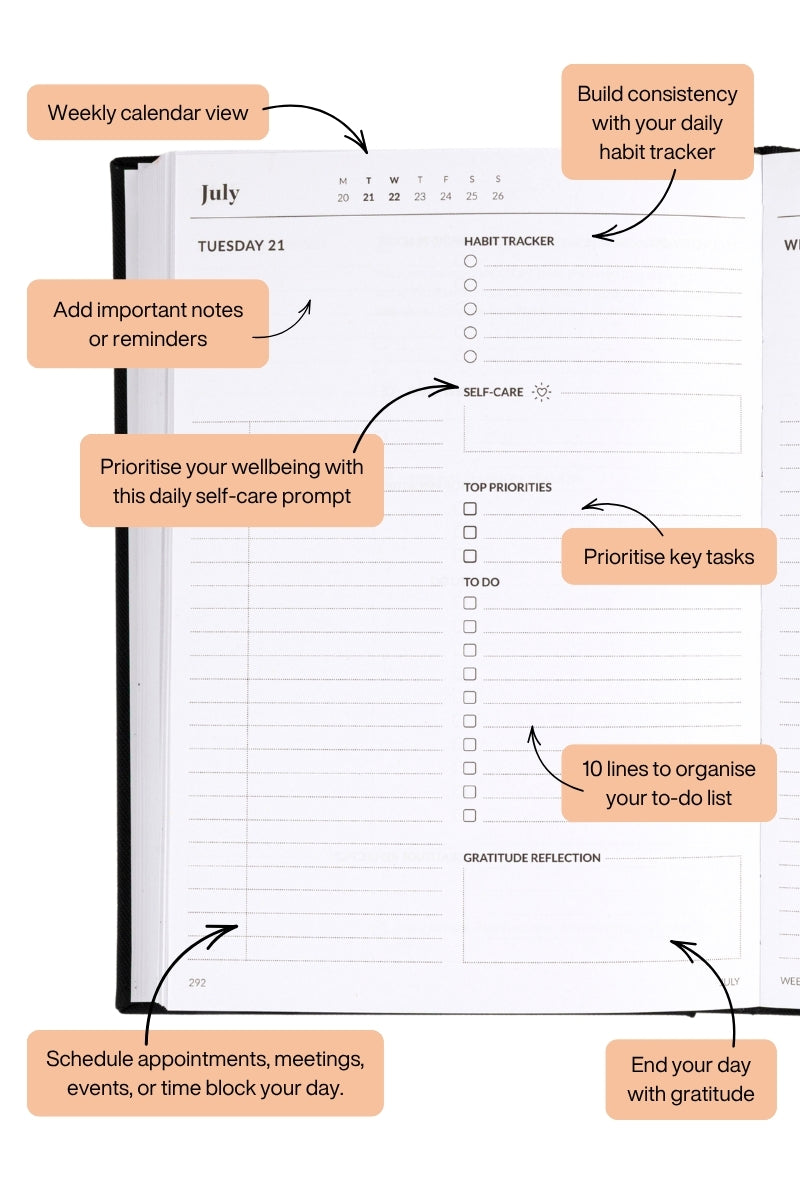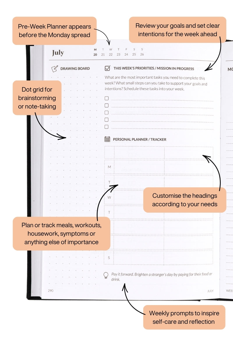 Free 60 day returns on all 2026 diaries and planners sold from our online store within Australia. Products must be unopened, in their original condition. If you'd like to try the layout before purchasing, please try a sample download here. See our returns page for more information.