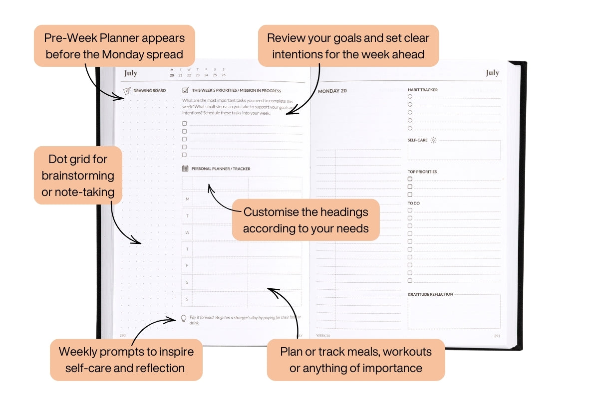 Balancing structure and flexibility, our unique Pre-Week Planner and day-to-a-page layout offer ample space for mindfully managing all areas of your life.