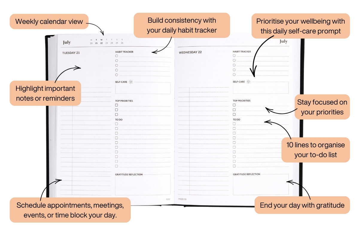 With built-in prompts for self-care, habits, and gratitude woven into your daily spread, you can stay consistent and focused on what truly matters.