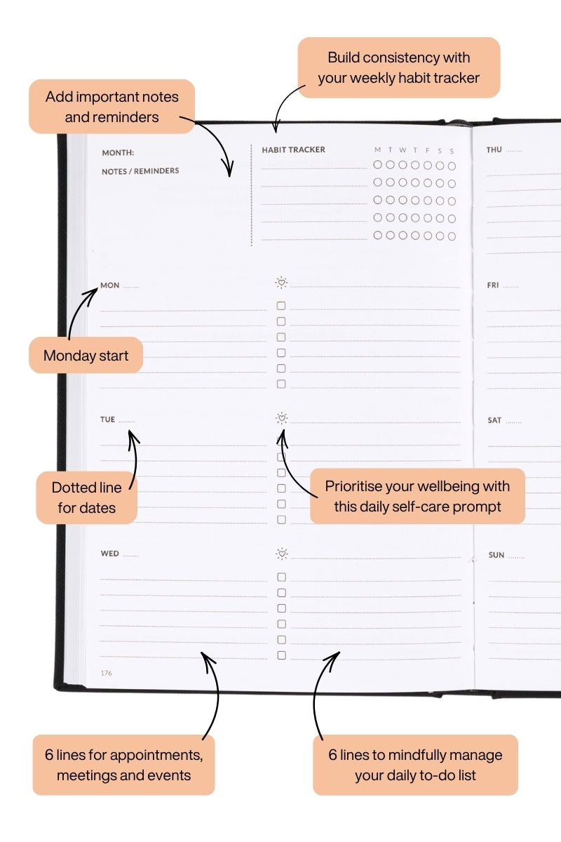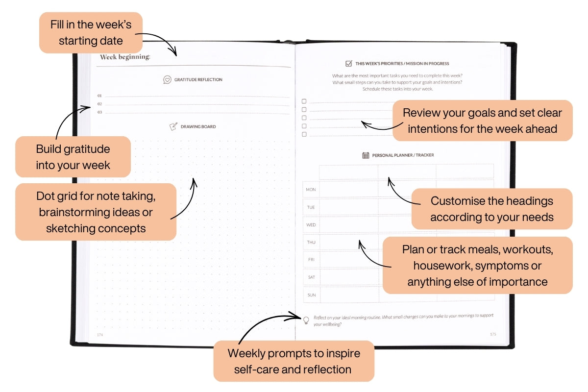 Our signature Pre-Week Planner and Weekly Spread layout gives you four planning pages per week to calmly organise all areas of your life.