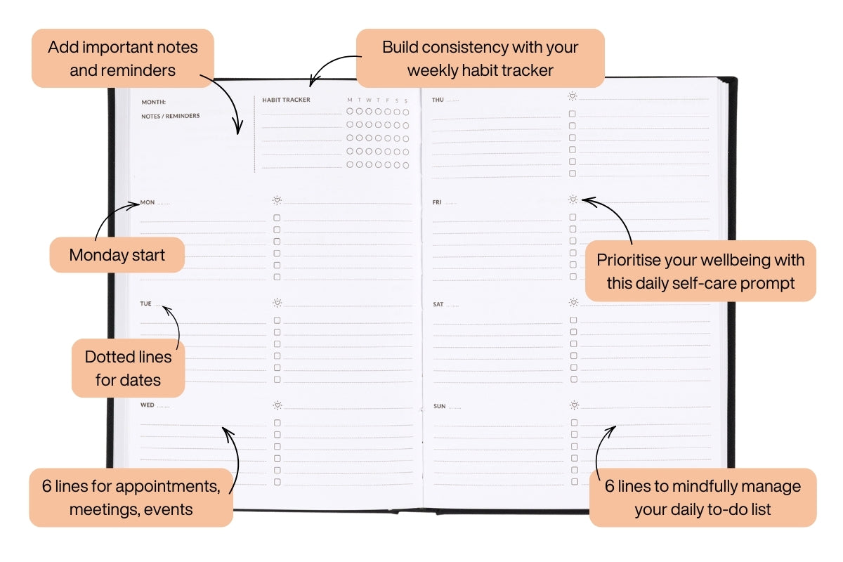 Undated Weekly Spread Layout: Generous space to organise your to-do list and schedule for the week ahead.