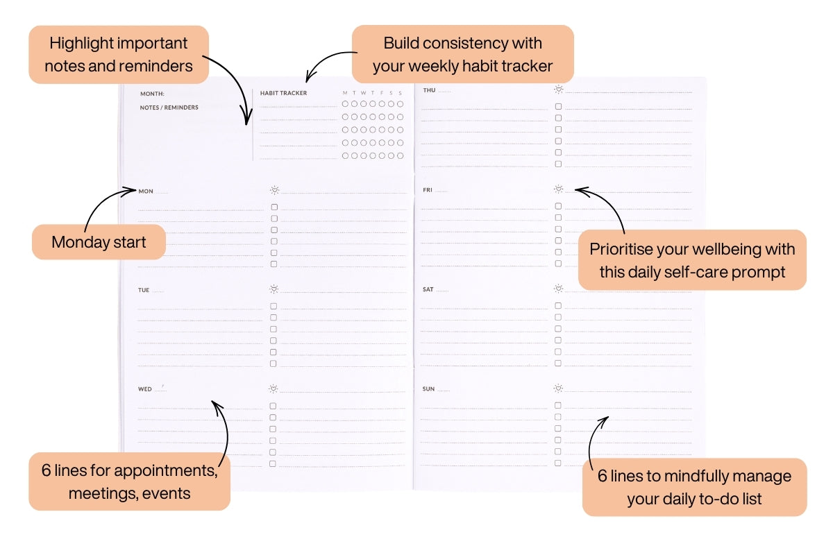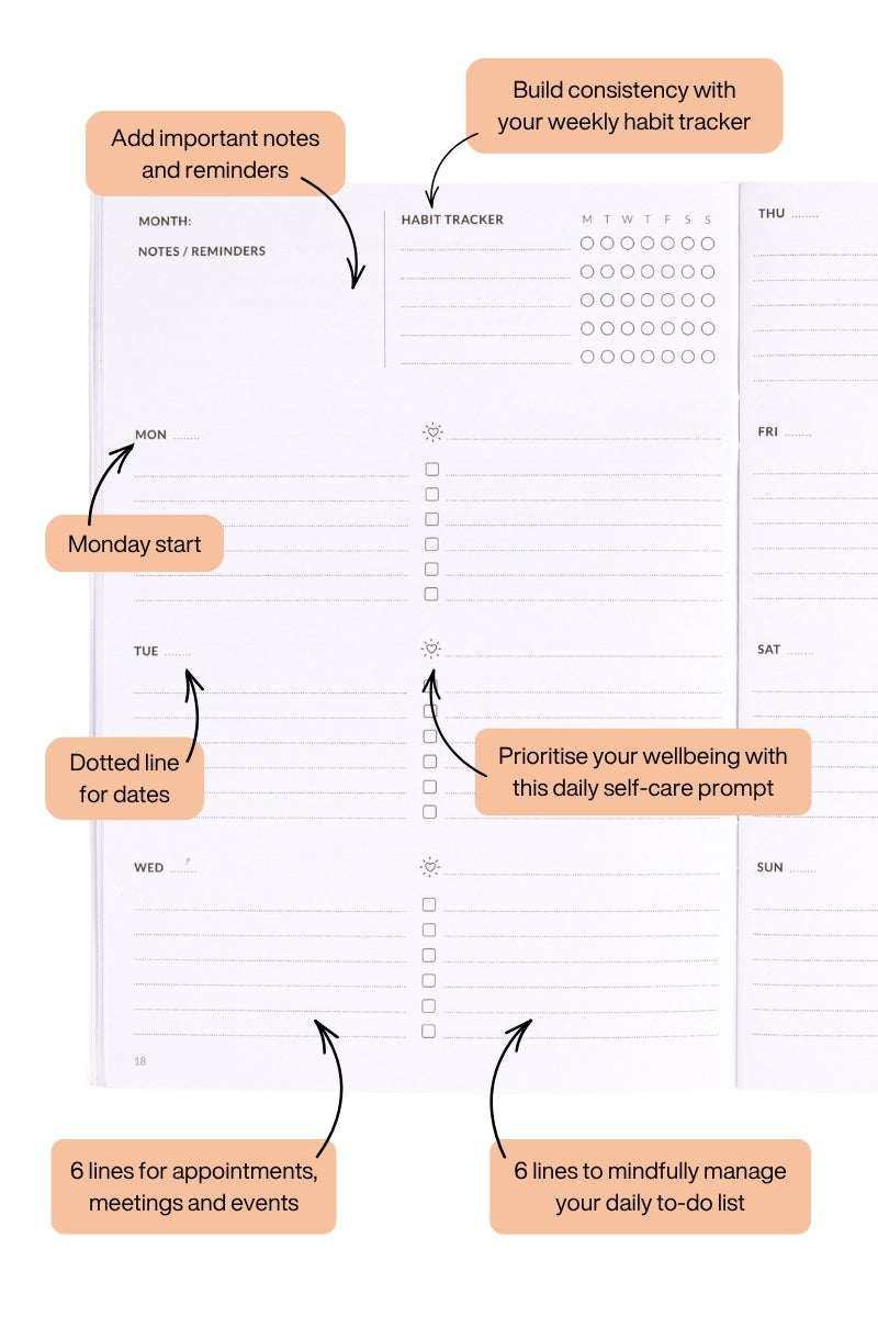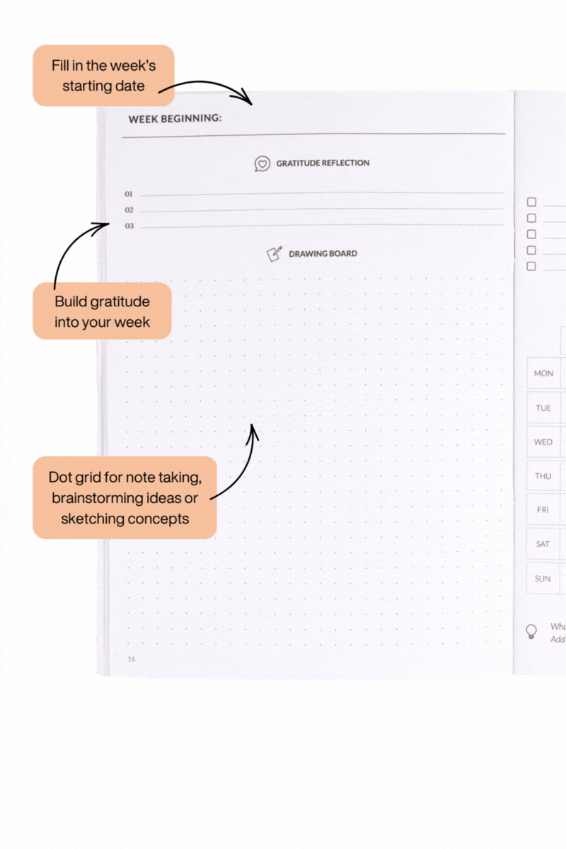 Weekly spread layout: Generous space to organise your to-do list and schedule for the week ahead.