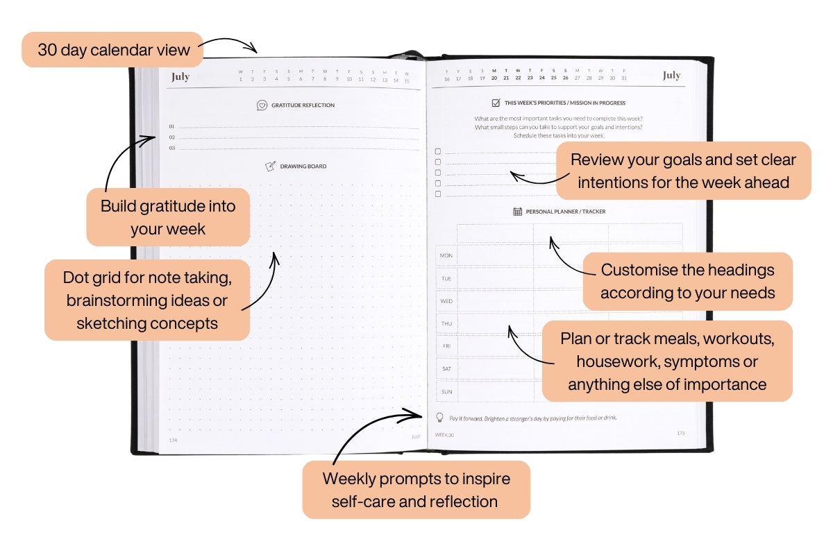 Our signature Pre-Week Planner and Weekly Spread layout gives you four planning pages per week to organise all areas of your life.