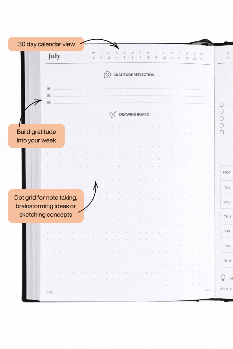 Weekly spread layout: Generous space to organise your to-do list and schedule for the week ahead.