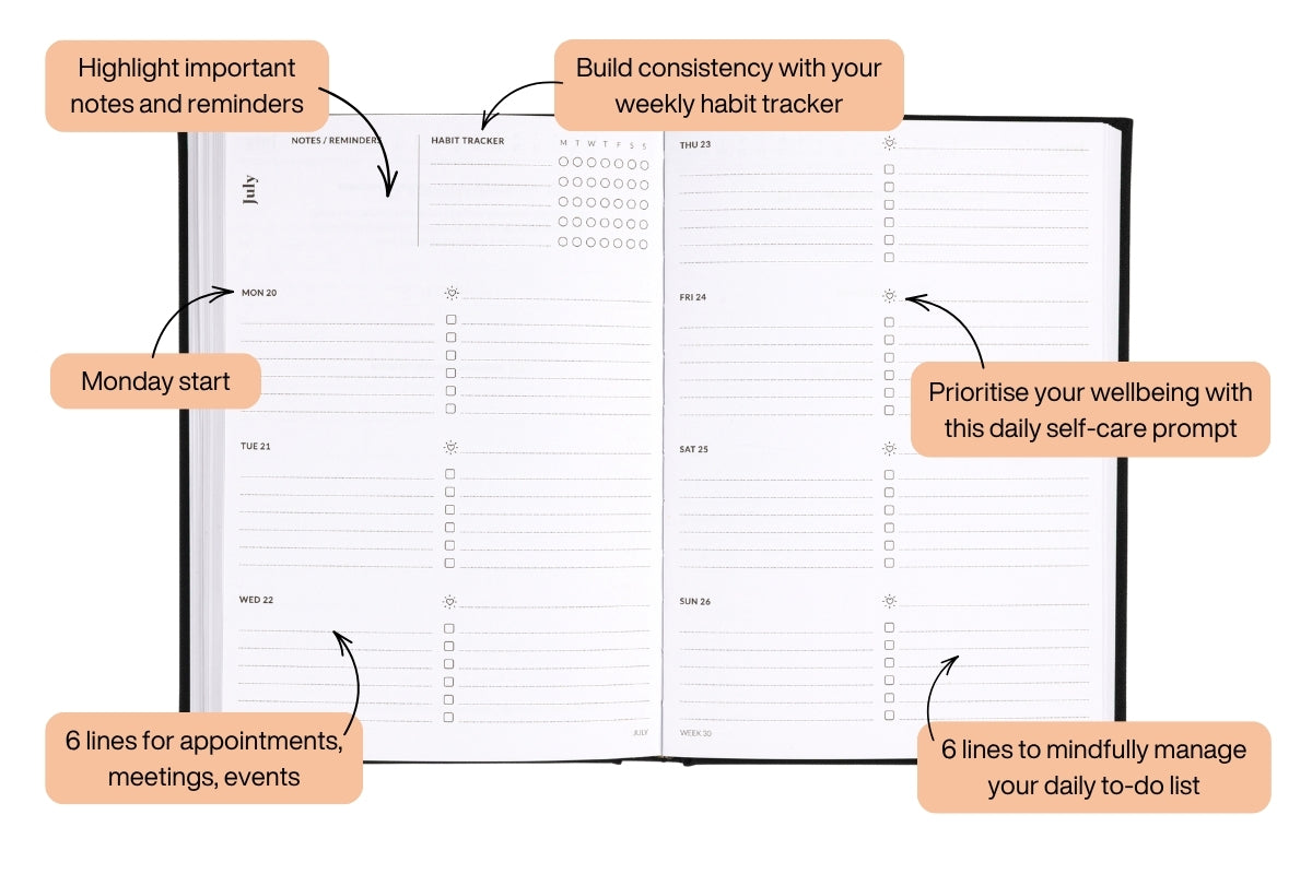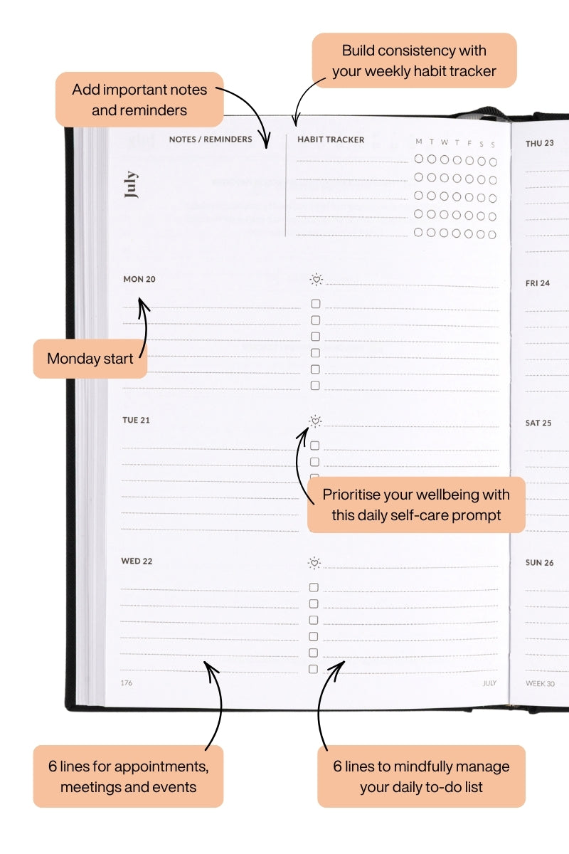 Free 60 day returns on all 2026 diaries and planners sold from our online store within Australia. Products must be unopened, in their original condition. If you'd like to try the layout before purchasing, please try a sample download here. See our returns page for more information.